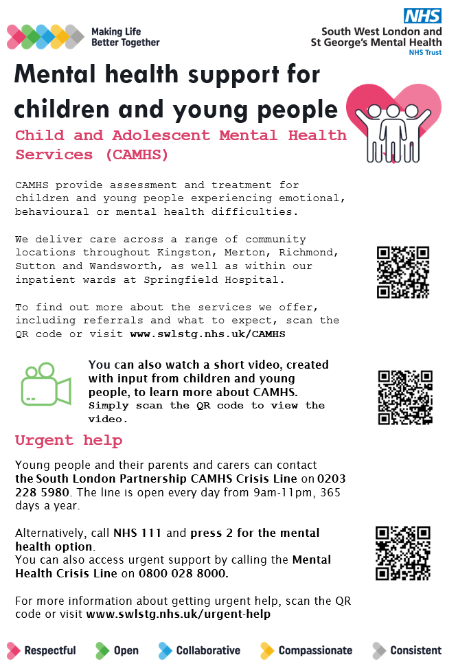 Click here for Young Minds the online and helpline support for anyone worried about the emotional wellbeing or mental health of a young person aged 0-25