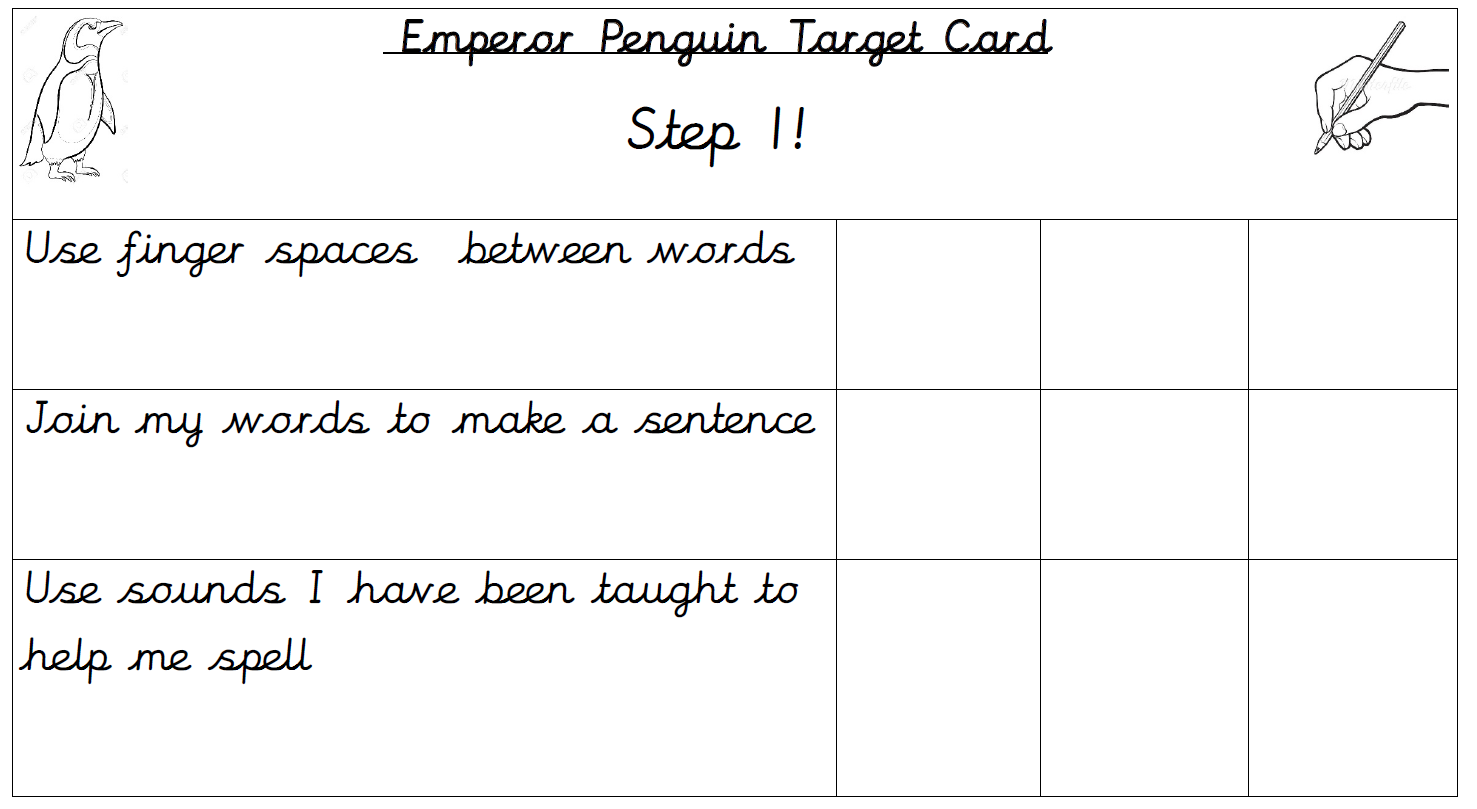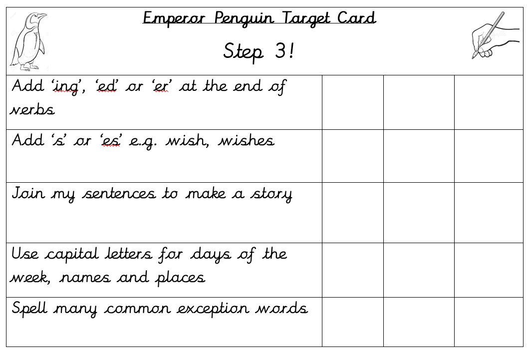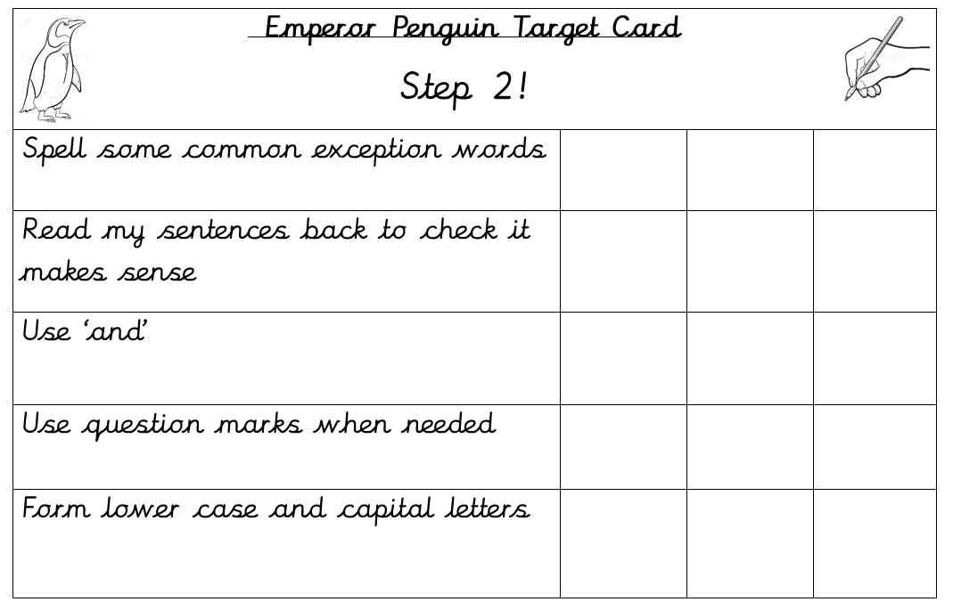 By the end of Year 1, children's letters are expected to be formed accurately (see letter formation rhymes in phonics section) and writing should be legible, consistently sized and sat on the line. Children are not expected to join their writing in Year 1, however as we move through the year, staff will begin to teach pre-cursive and cursive writing to those who are ready to progress.